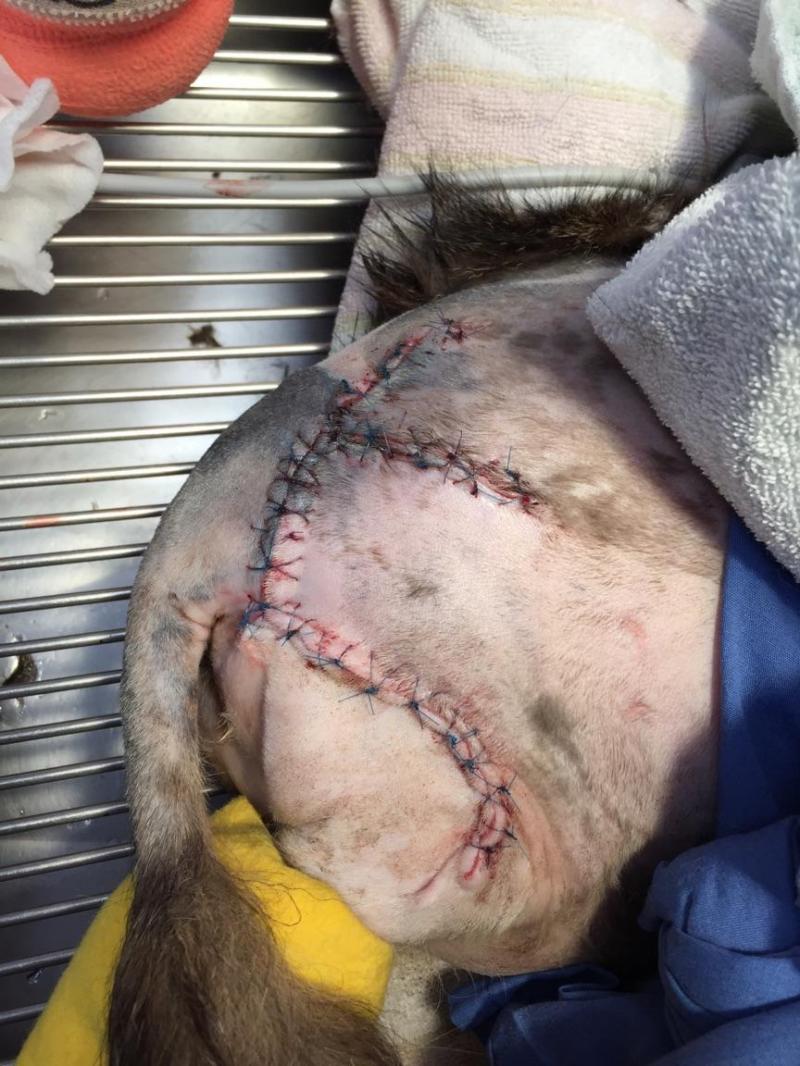 Owner presented pet to clinic, had been missing from home for a week, unable to walk, could stand only with assistance, open wound as shown. Radiographs also showed fractured sacral vertebrae. Administered Prednisone taper for 10 days to reduce swelling on the spinal chord as first step of this process, cat walking on their own at the end of 10 days. Once cat was off the prednisone, began a Manuka Honey mixed with insulin application to the open wound. After two weeks, wound healed enough to be able to allow for surgery. Closed the wound with sutures as shown, cat now walking as before, owner very happy with results.